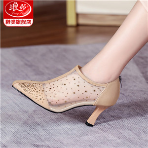浪莎法式尖頭高跟鞋女細跟2021春夏新款深口鏤空網(wǎng)紗水鉆休閑單鞋