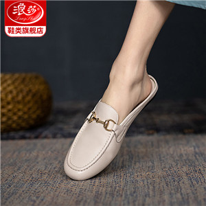 浪莎包頭拖鞋女夏外穿2021春真皮平底半拖鞋粗跟圓頭搭扣穆勒涼拖